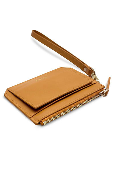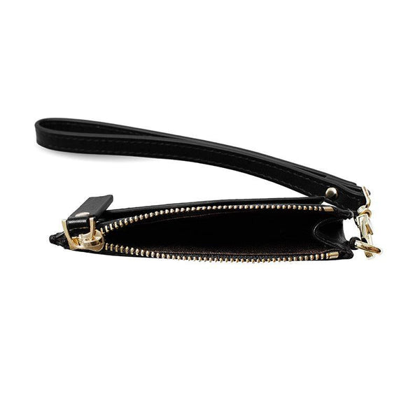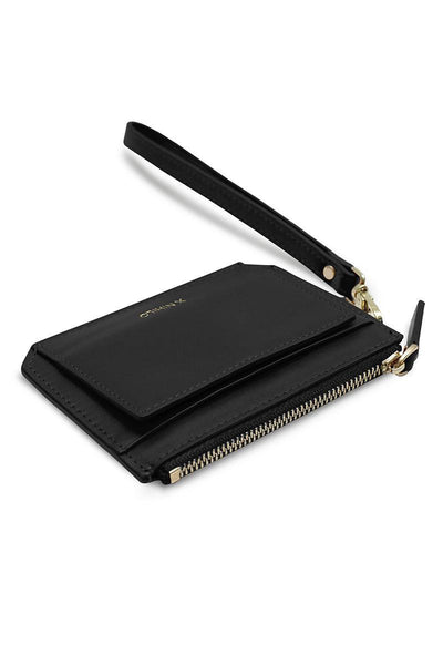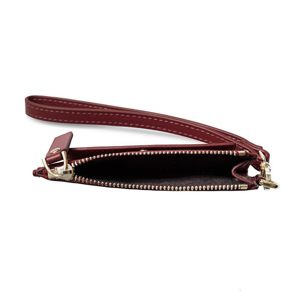 Crafted from supple leather, Charlie mini leather wallet secure coins within finished with a golden hardware zip pocket. Wallet comes with a removable wrist strap. Comes in black, red, and mustard.
