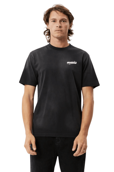 A t-shirt sent back to us from the future. Sink into a spaced-out black wash, crafted with a 100% eco-friendly blend of recycled cotton and organic cotton jersey. This tee features our retro-fit, with a relaxed drop and a minimal spaced out Afends logo.